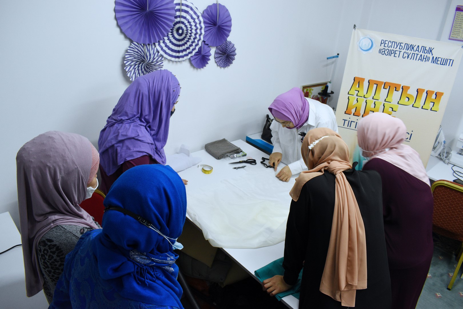 Respýblıkalyq «Áziret Sultan» meshitindegi «Altyn ıne» tegin tigin úıirmesinde búgin áıelderdiń sándi bas kıimiń (tıýrban) tigýden sheberlik saǵaty bolyp ótti. Úıirme jetekshisi Rahmetova Saltanattyń uıymdastyrýymen tigin ortalyǵyna belgili qolónershi Maqpal Ismaılova shaqyrylyp, shákirttermen óz tájirıbesin bólisti.