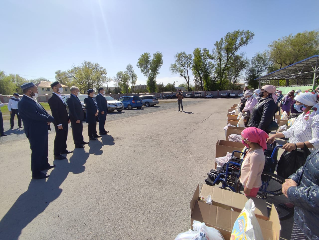 Qaıyrymdylyq sharasynda 65 otbasyǵa azyq-túlik salynǵan qoraptar taratyldy. Qasıetti aıda zeket retinde meshitke berilgen 2 iri qara maly soıylyp, ol túgeldeı osy kezdesýge kelgen turǵyndarǵa úlestirilip berildi.