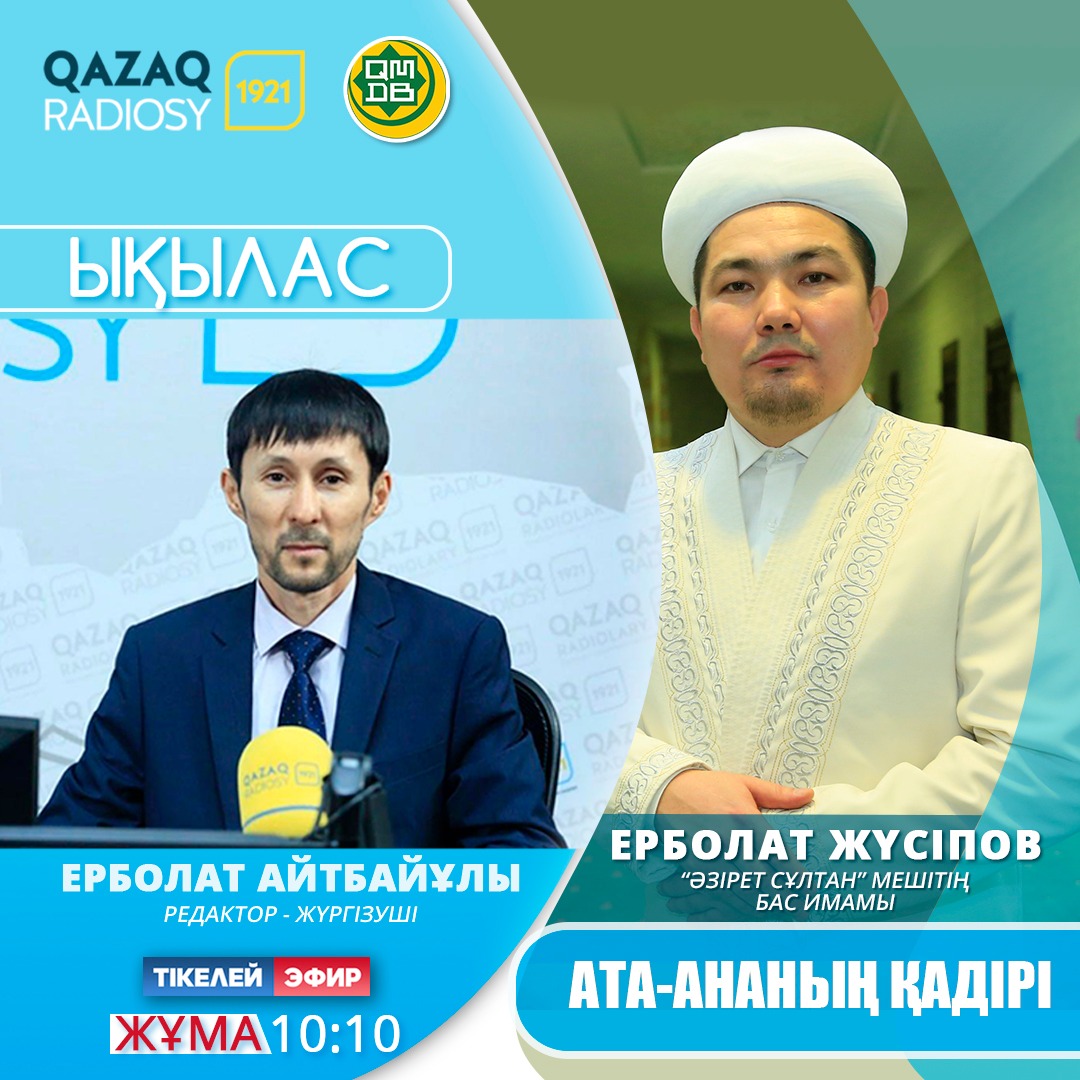 Al erteń tikeleı áýe tolqynynda QMDB Nur-Sultan qalasy ókildiginiń jáne respýblıkalyq «Áziret Sultan» meshitiniń bas ımamy Erbolat Júsipov «Ata-ananyń qadiri» taqyrybynda áńgime órbitedi. Taǵylym men nasıhatqa toly habardy erteń, saǵat 10:10-da «Qazaq radıosynan» tyńdaı alasyz!