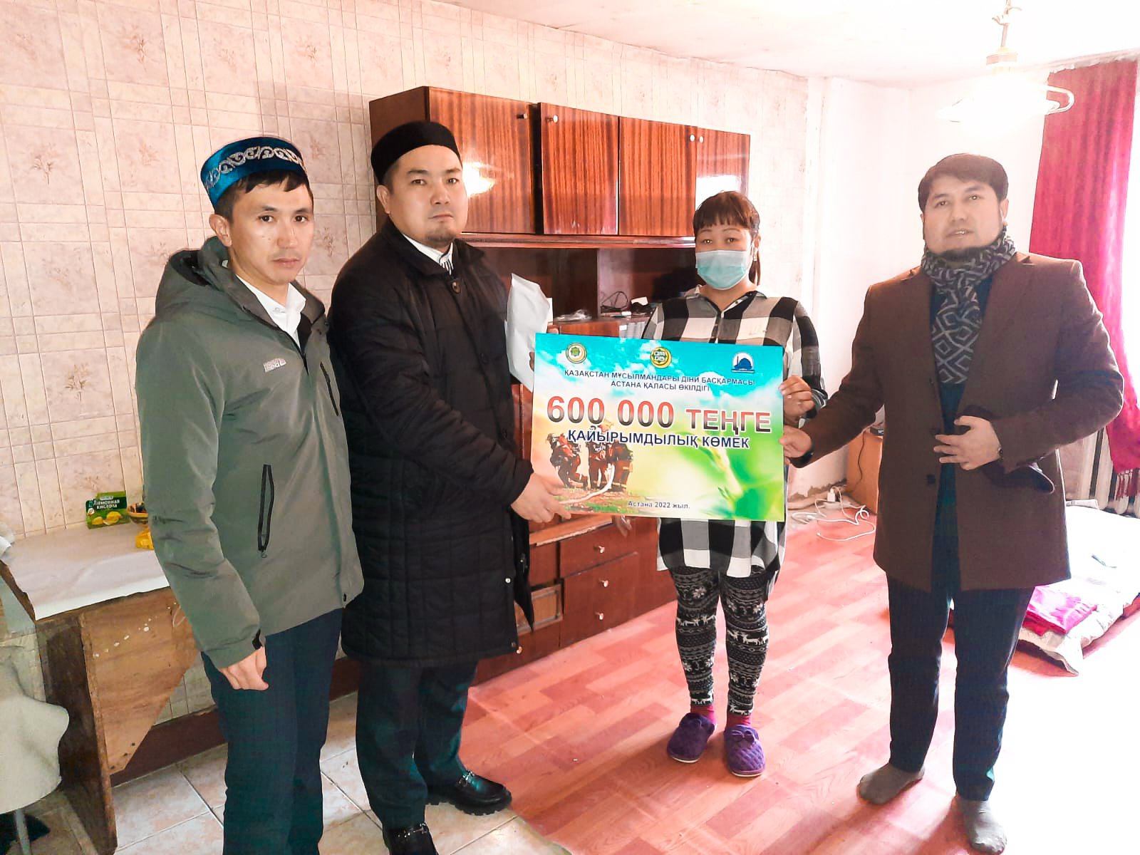 ҚМДБ Астана қаласы өкілдігінің ұйытқы болуымен бүгін баспанасы өртеніп кеткен екі отбасыға қаржылай көмек көрсетілді. Қала бас имамы Ерболат Жүсіпов апатқа ұшыраған отбасыларды арнайы зиярат жасап, 500 000 және 600 000 теңге қайырымдылық сертификатын табыстап қайтты.