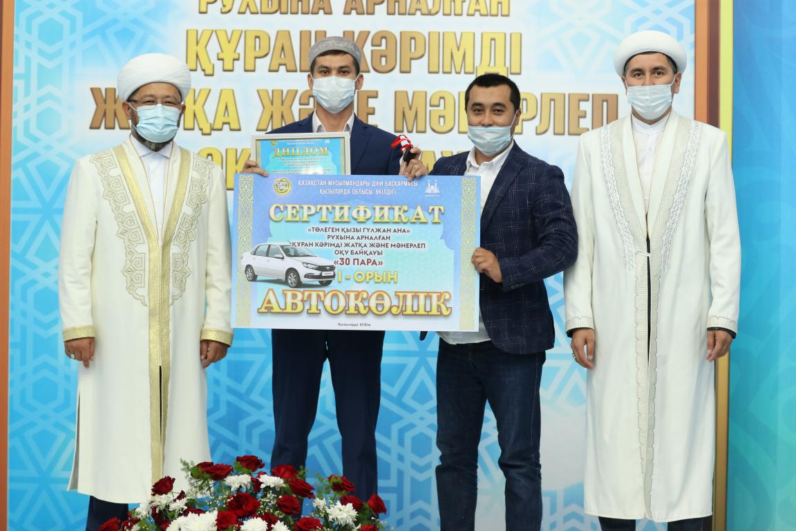 Қазақстан мұсылмандары діни басқармасының төрағасы Наурызбай қажы Тағанұлы Сыр еліне жасаған жұмыс сапарында Қызылорда облысы бойынша өткен Құран жаттау және мәнерлеп оқу байқауының 30 пара бойынша бірінші орын иегері Шыңғысхан Садуовқа автокөлік кілтін табыстады.