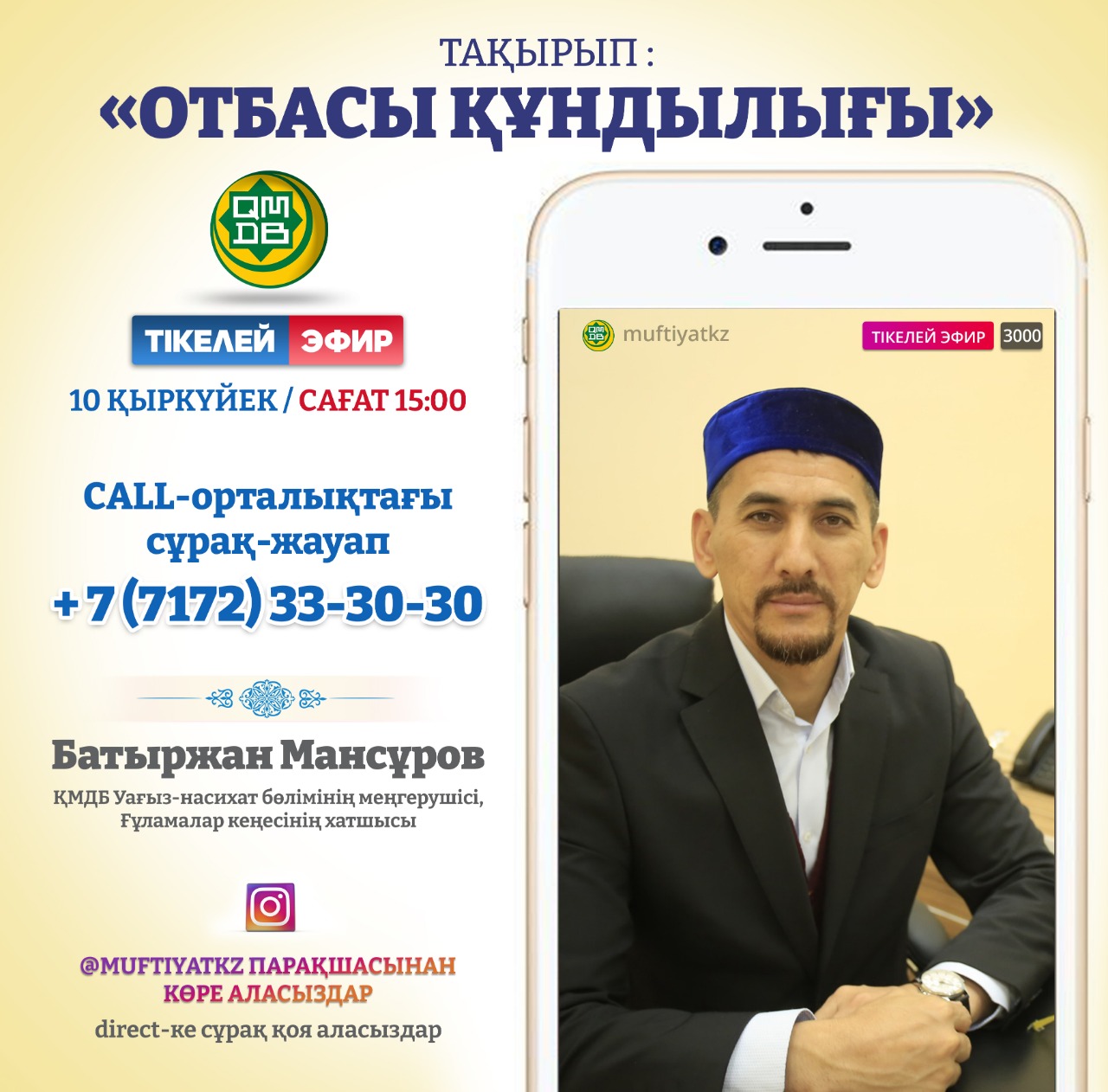 Прямую трансляцию можно посмотреть на странице muftiyat.kz в Instagram, задать вопросы в direct или позвонить по телефону +7 (7172) 33-30-30.