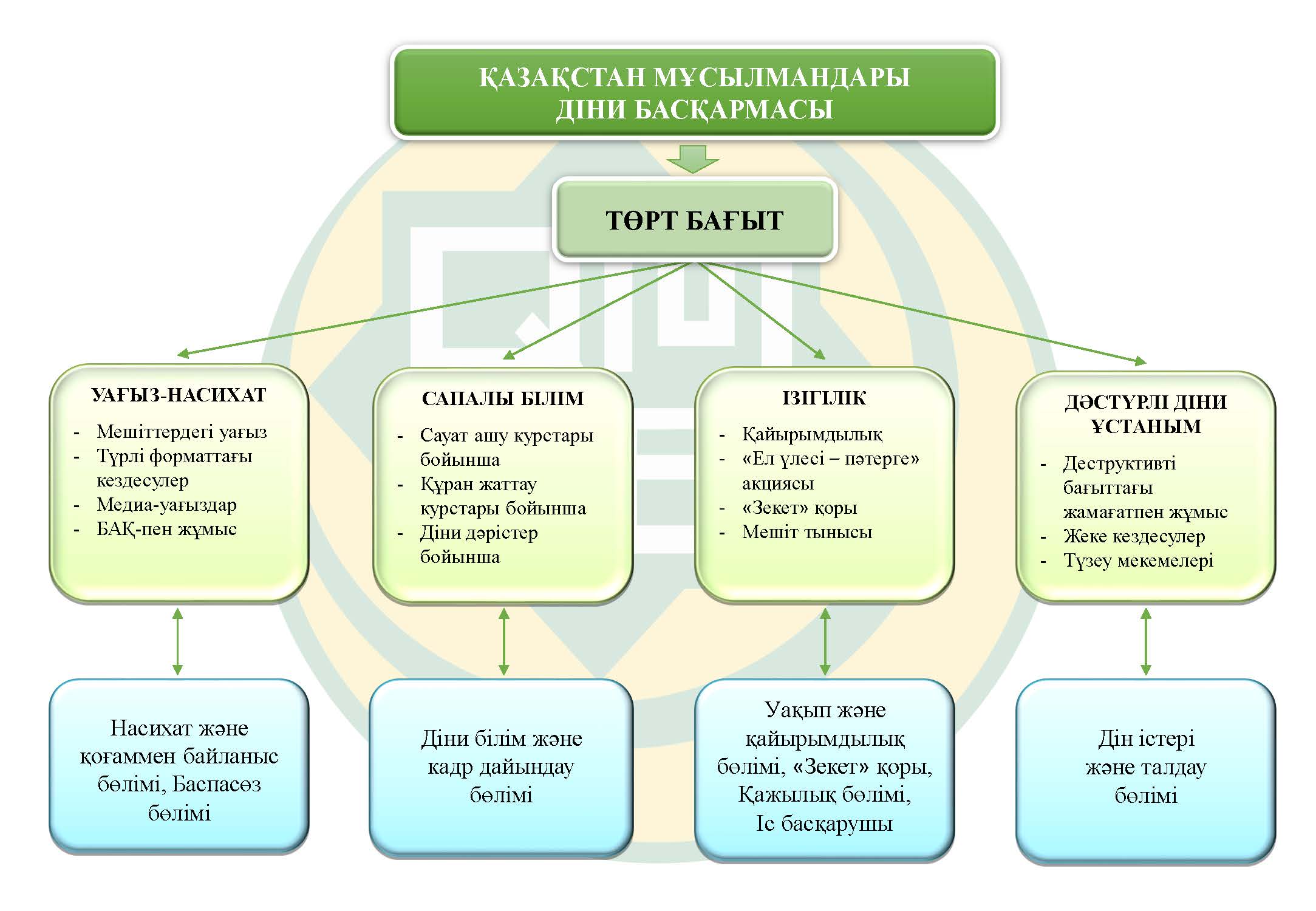 Четыре направления, утвержденные по предложению Верховного муфтия Серикбая кажы Ораза – это пропагандистско-проповедническая деятельность, качественное образование, добродеятельность и традиционная религиозная позиция.