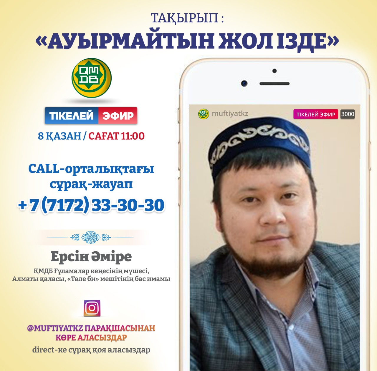 Ерсин Амире, известный исламовед, член Совета улемов ДУМК, главный имам мечети «Толеби» в Алматы, ответит на вопросы читателей во время очередной трансляции проекта «Вопросы и ответы в call-центре».