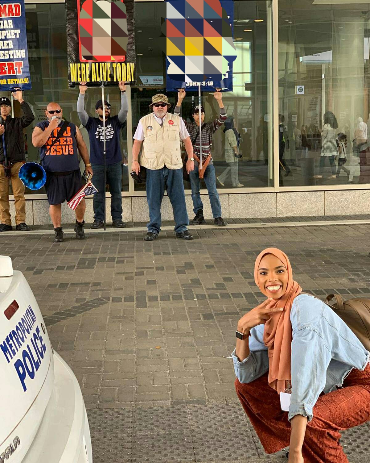 В Вашингтоне 24-летняя мусульманка Шаймаа Исмаэль сделала фотографию перед группой протестующих с антиисламистскими плакатами и покорила интернет-пользователей. Девушка присела перед суровыми мужчинами в руках которых были баннеры с исламофобскими высказываниями, улыбнулась и сделала рукой так называемый жест мира.