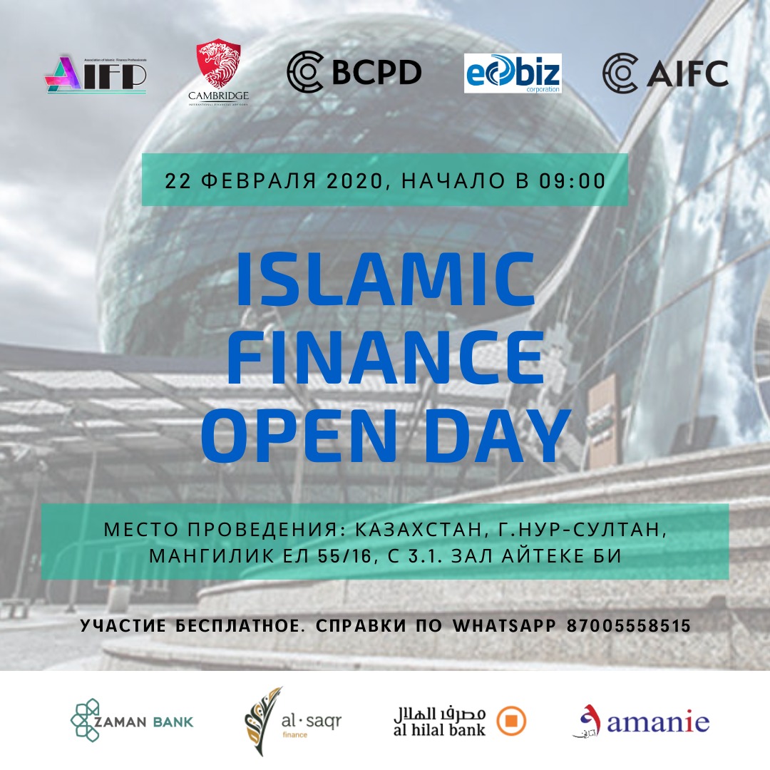 Ассоциация Профессионалов Исламских Финансов совместно с Бюро непрерывного профессионального развития МФЦА приглашает всех желающих бесплатно посетить «Islamic Finance Open Day». Мероприятие будет проходить 22 февраля 2020 г. с 09:00 до 18.00, где у Вас будет возможность ознакомиться с продуктами Исламских финансовых компаний и получить полезную информацию.