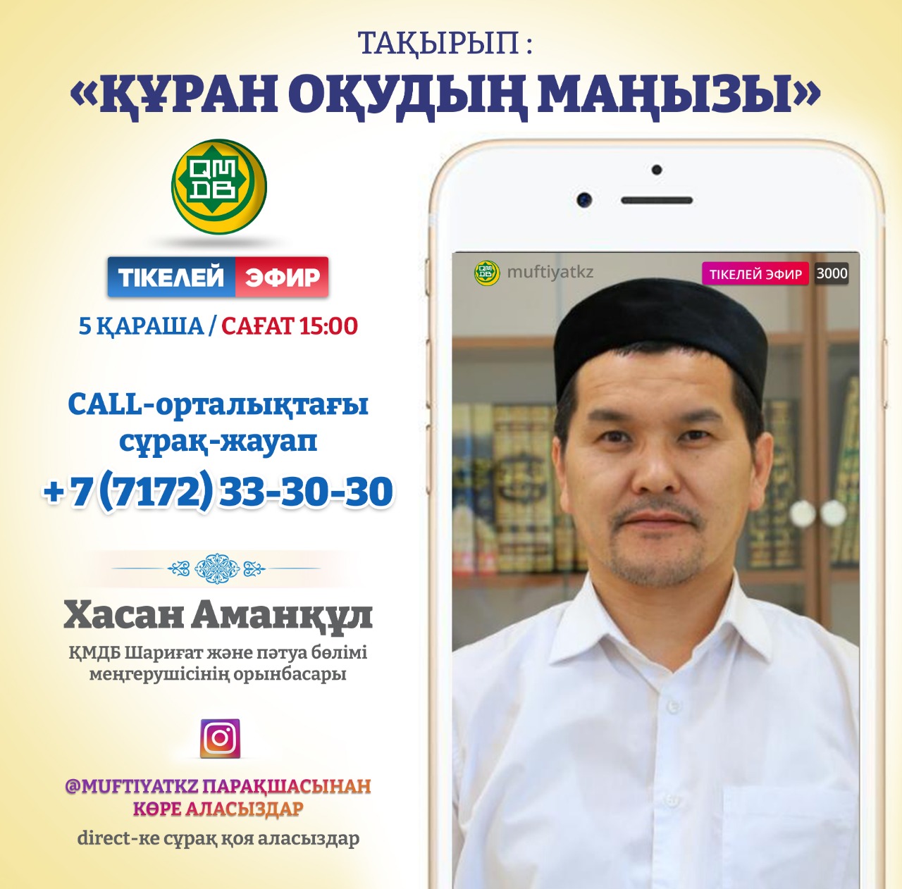 В прямом эфире будут обсуждаться важность чтения Священного Корана и его польза для мирской и вечной жизни. Если у вас есть вопросы по этому поводу, вы можете позвонить по телефону +7 (7172) 33-30-30 и посмотреть прямую трансляцию на странице ДУМК в Instagram @muftiyatkz. Вопросы также можно отправлять в direct.