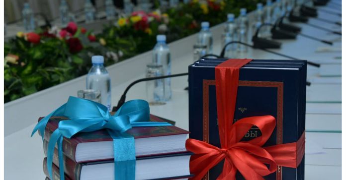 Присутствовавший на презентации книг государственный секретарь РК Крымбек Кушербаев перерезал ленту одной из стопок книг. В своей поздравительной речи он подчеркнул, что духовная сокровищница нашего народа пополняется еще двумя познавательными произведениями.
