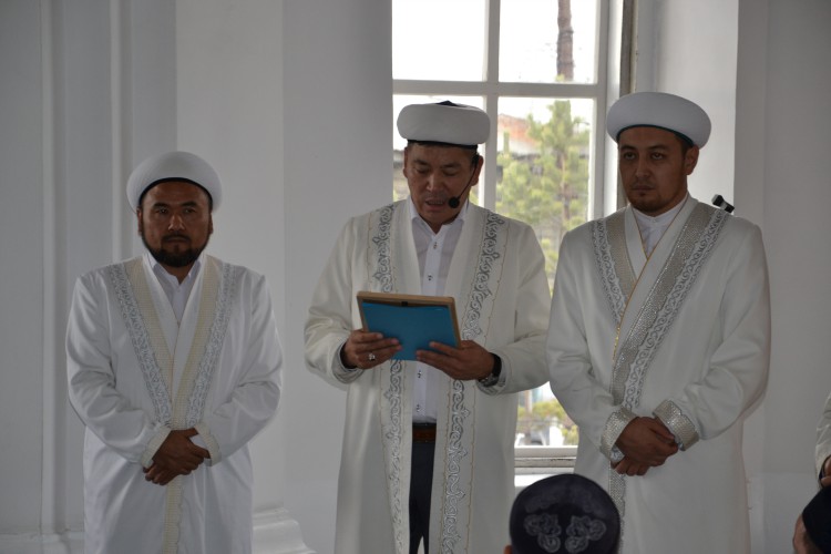 Турдыбаев Камалжан Бекбосынулы, начальник Отдела благотворительности и уакфа ДУМК, передал приветствие Председателя Духовного управления мусульман Казахстана Серикбая кажы Сатыбалдыулы сотрудникам мечети "Кос мунаралы", представил джамаату нового имама, и зачитал приказ Верховного муфтия.