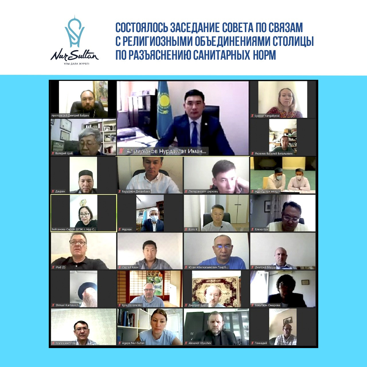 Заседание Совета по связям с религиозными объединениями при акимате города Нур-Султан состоялось под председательством руководителя столичного Управления по делам религий Нурдаулета Альмуханова. Он рассказал о необходимости организовать работу объектов религиозных объединений в рамках проекта «Ashyq».