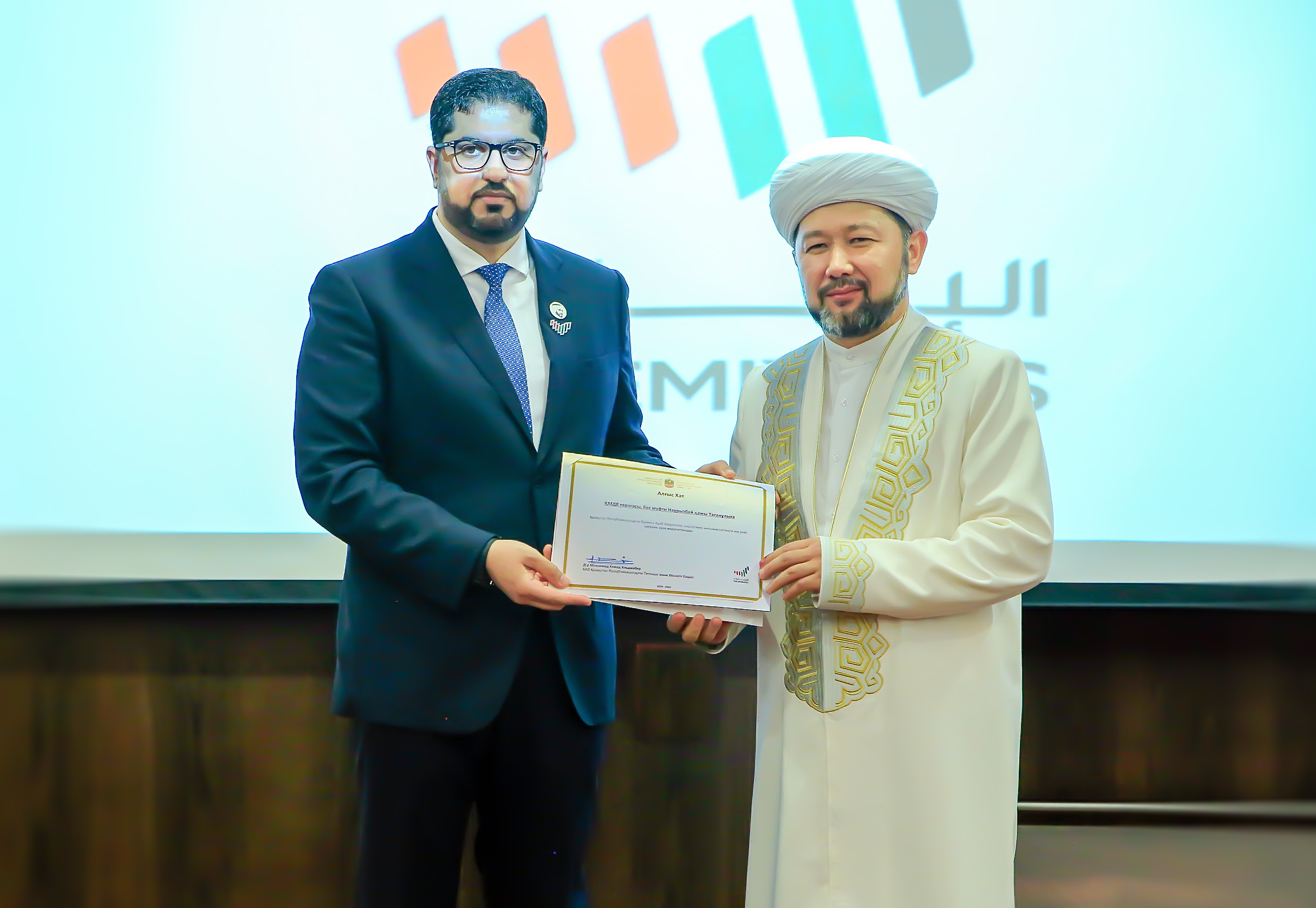 В мероприятии также принял участие председатель ДУМК, Верховный муфтий Наурызбай кажы Таганулы. Посол Объединенных Арабских Эмиратов в Казахстане г-н Мухаммед Ахмед аль-Джабер вручил специальное благодарственное письмо Верховному муфтию за его вклад в укрепление сотрудничества с посольством.
