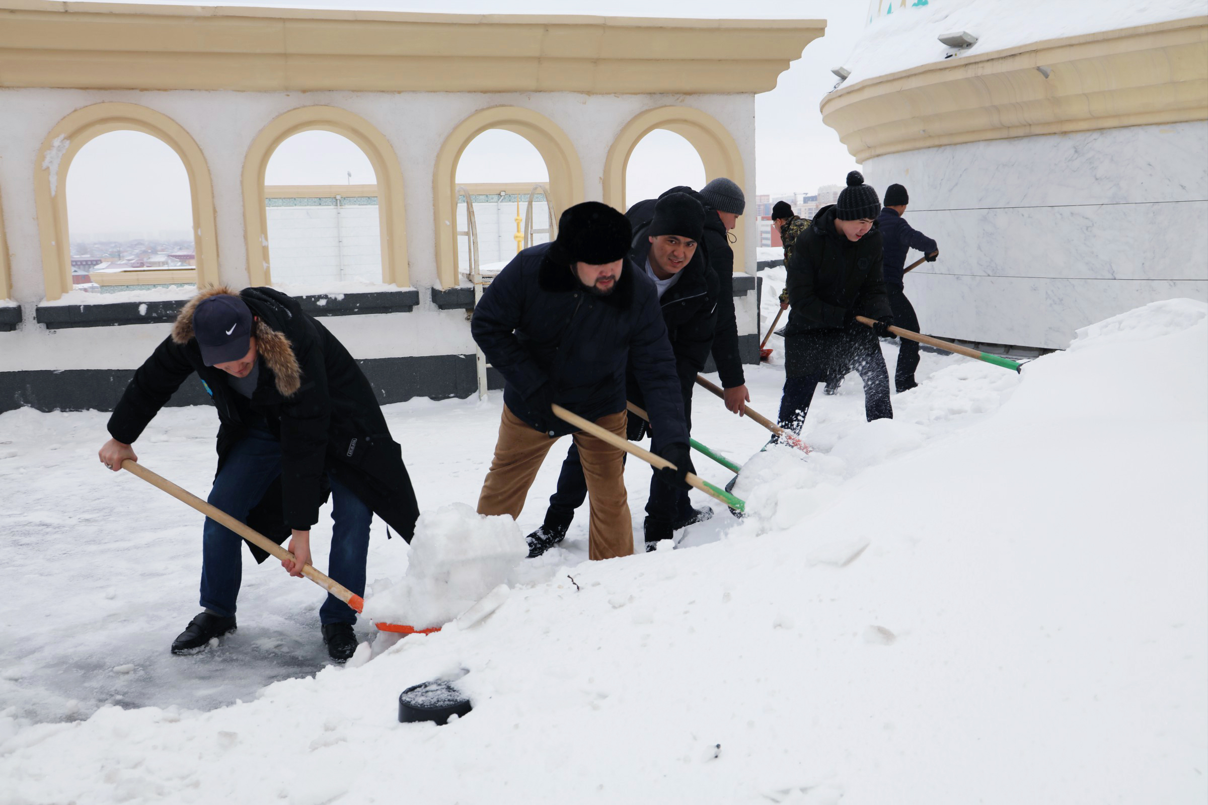 Скоро заснеженную северную столицу «посетит» весна и джамаат Республиканской мечети начал активно к ней готовиться посредством уборки территории, в частности крыши, от снежных заносов.