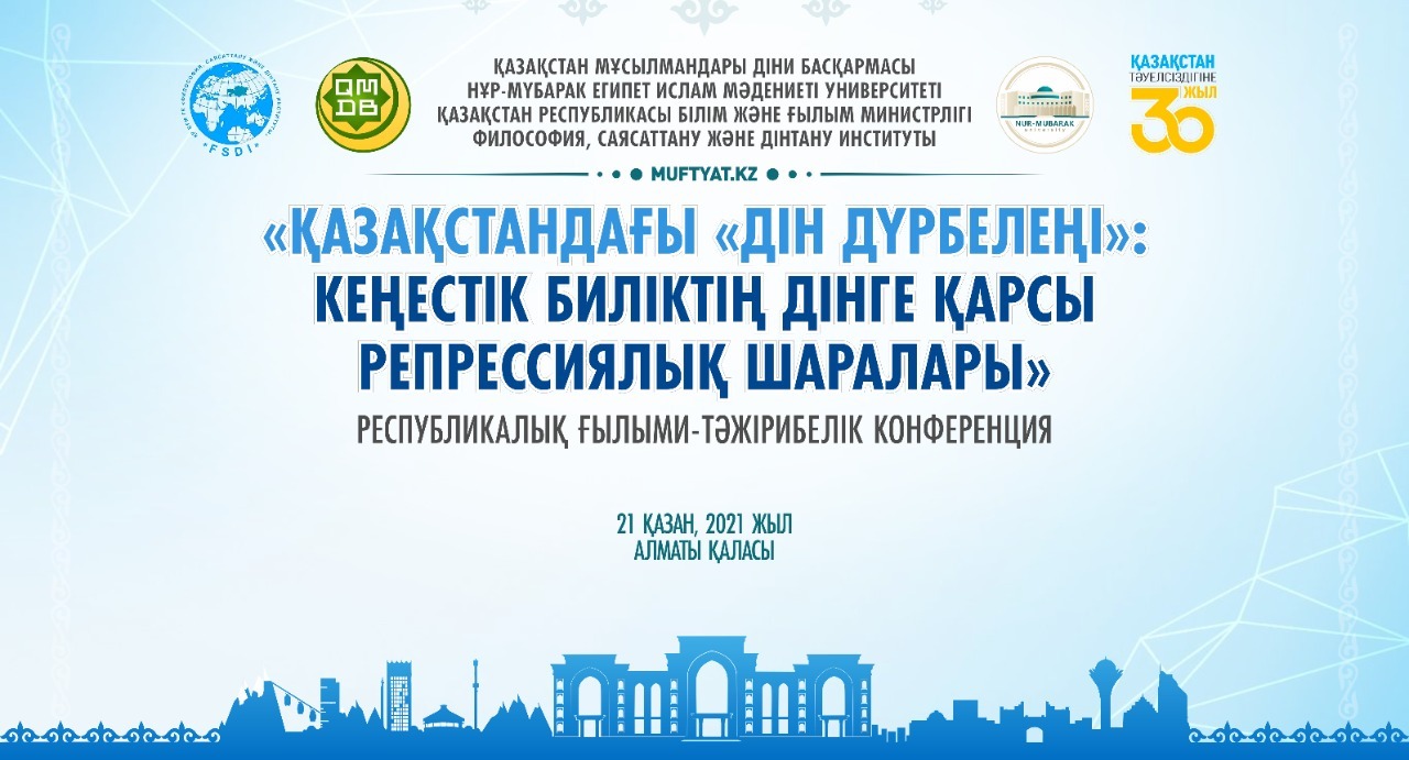 21 октября Духовное управление мусульман Казахстана и Институт философии, политологии и религиоведения проведут республиканскую научно-практическую конференцию «ҚАЗАҚСТАНДАҒЫ «ДІН ДҮРБЕЛЕҢІ»: КЕҢЕСТІК БИЛІКТІҢ ДІНГЕ ҚАРСЫ РЕПРЕССИЯЛЫҚ ШАРАЛАРЫ» в здании Университета Нур-Мубарак в Алматы.
