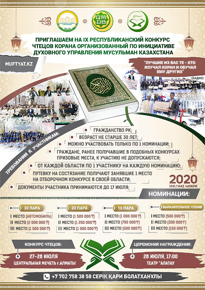 27-28 июля 2020 года в Алматы состоится IX Республиканский конкурс чтецов Кур`ана организованный по инициативе Духовного управления мусульман Казахстана