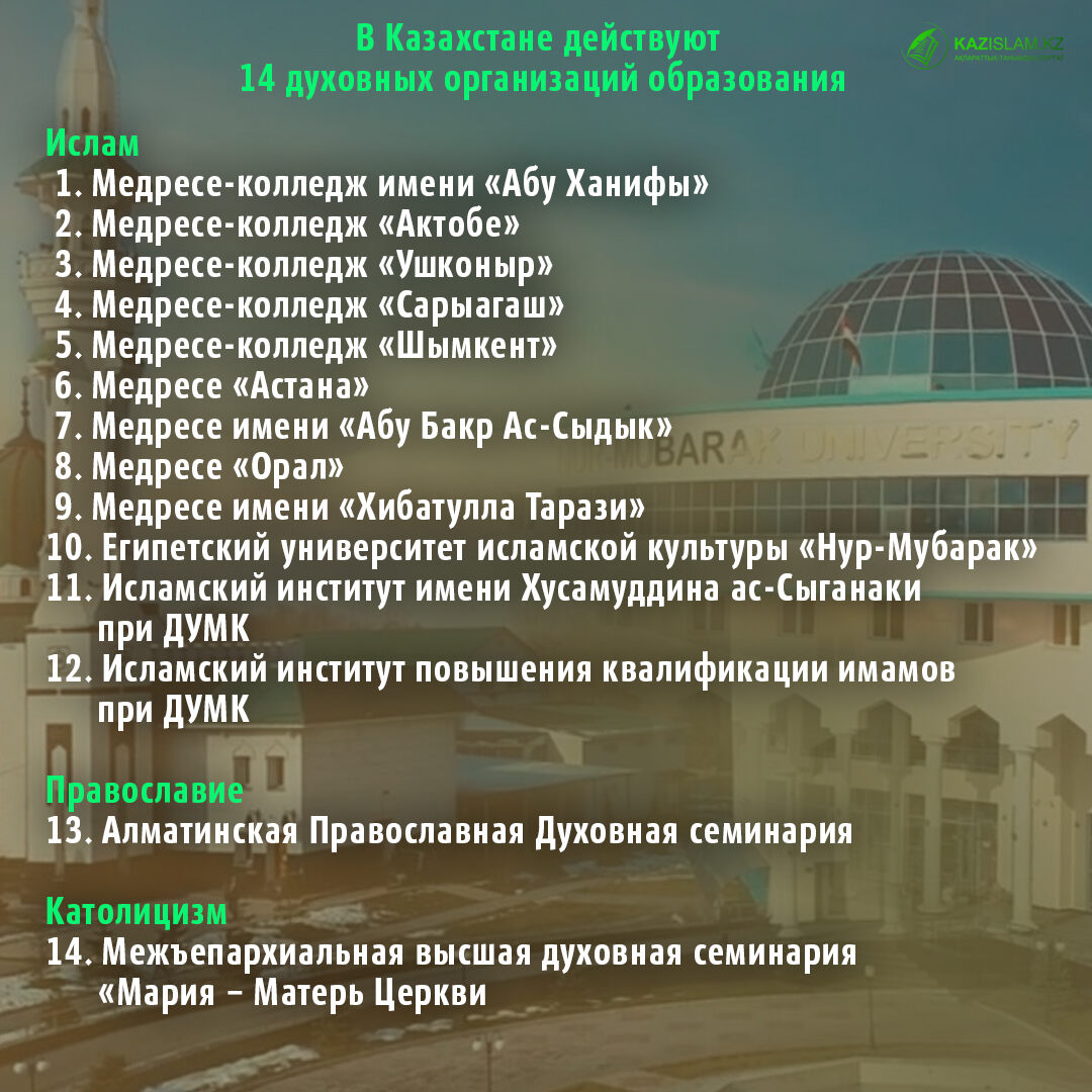 На сегодняшний день в Казахстане действуют 14 официальных духовных организаций образования.