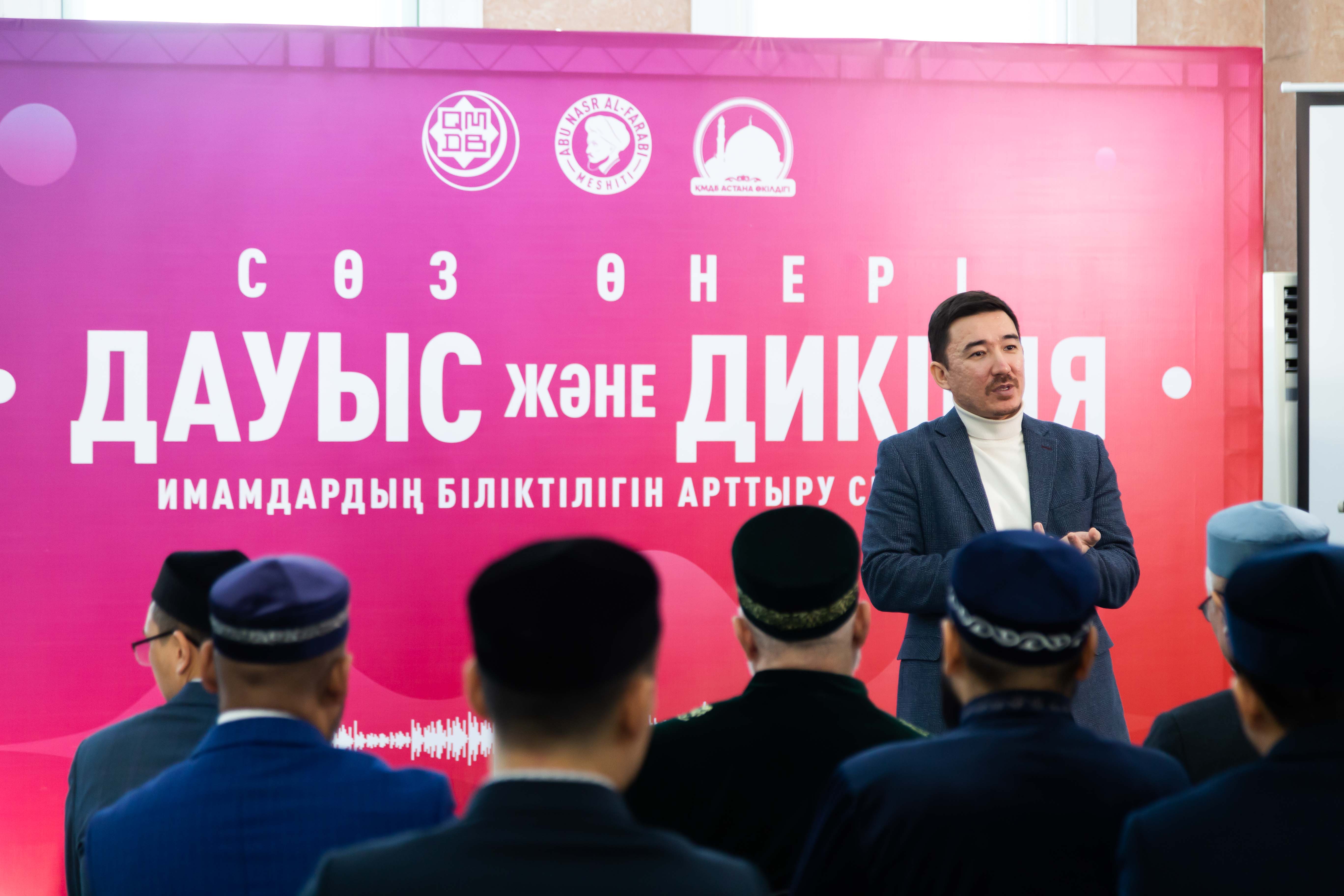 Диктор радио «Қазақ» Мухаммед Али Болатулы провел специальную лекцию для имамов столичных мечетей об ораторском искусстве, грамотной речи и важности голоса и дикции.