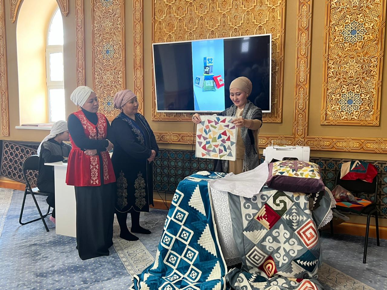 На мастер-класс были приглашены Калелова Шынар Калымбеккызы, частный предприниматель в сфере шитья, основатель школы ремесел «Шынар», и Дакис Бегжан, специалист по кройке и шитью. Они показали прихожанам, как сшить подушку с узорами, а также примеры украшения шали национальными узорами.