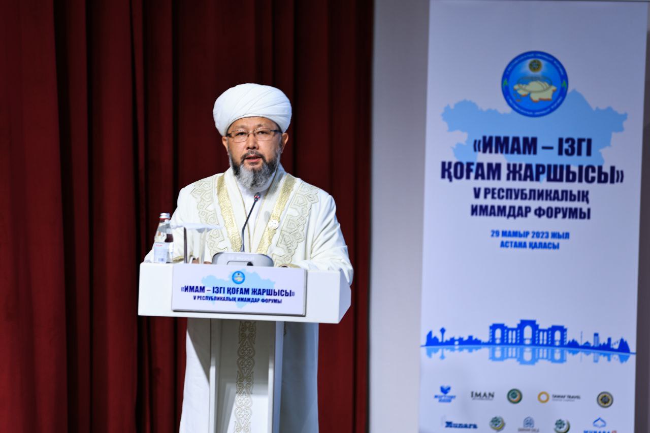 «На сегодняшнем пятом форуме имамов предлагаем рассмотреть и утвердить документы платформы «Порядок проведения коллективной молитвы имамом», «Роль Духовного управления мусульман Казахстана в пропаганде духовных (религиозных и национальных) ценностей», «Духовный облик паломника». Поскольку каждый имам является духовным лидером в каждом регионе, община объединяется и поклоняется вместе с ним. Целью принятия документа «Порядок проведения коллективной молитвы имамом» является гармонизация порядка коллективной молитвы в мечетях, недопущение недопонимания среди верующих, а также прославление традиционного ханафитского мазхаба, которому следовали наши предки.